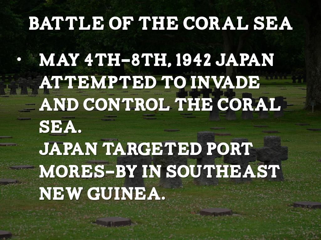 • May 4th-8th, 1942 Japan attempted to invade and control the Coral Sea. Japan targeted Port Mores-by in southeast New Guinea.