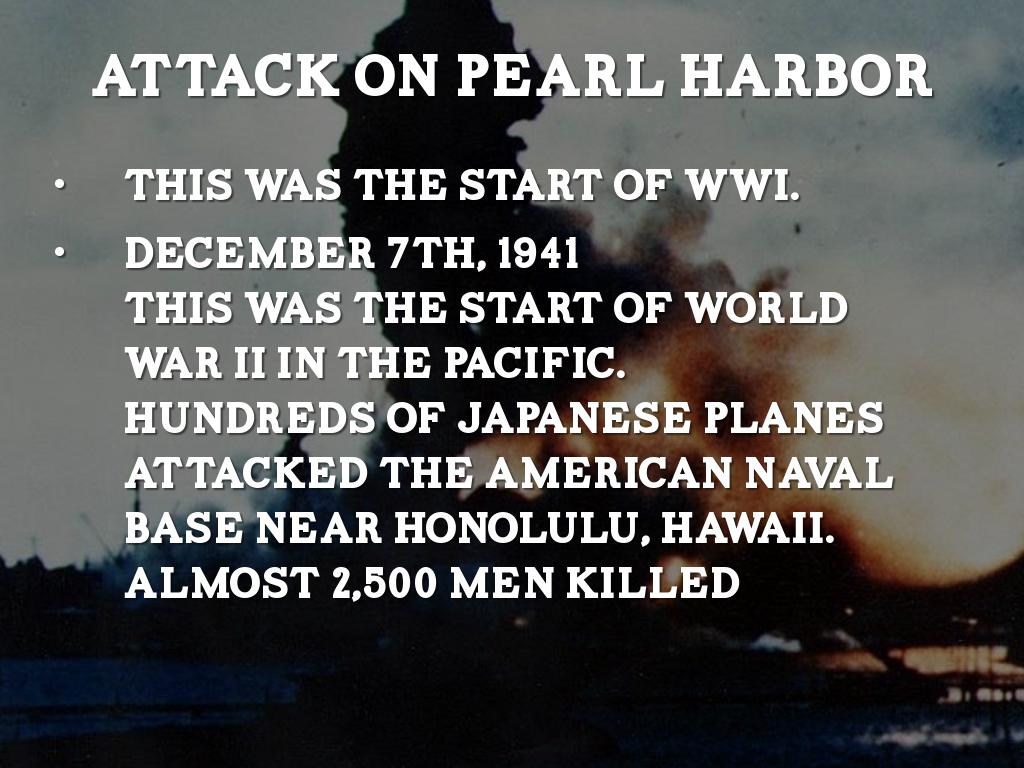 • December 7th, 1941 This was the start of World War II in the Pacific. Hundreds of Japanese planes attacked the American Naval Base near Honolulu, Hawaii. Almost 2,500 men killed