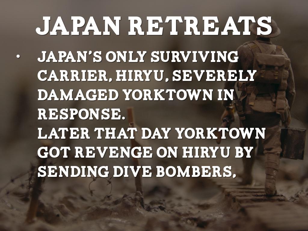 • Japan’s only surviving carrier, Hiryu, severely damaged Yorktown in response. Later that day Yorktown got revenge on Hiryu by sending dive bombers,