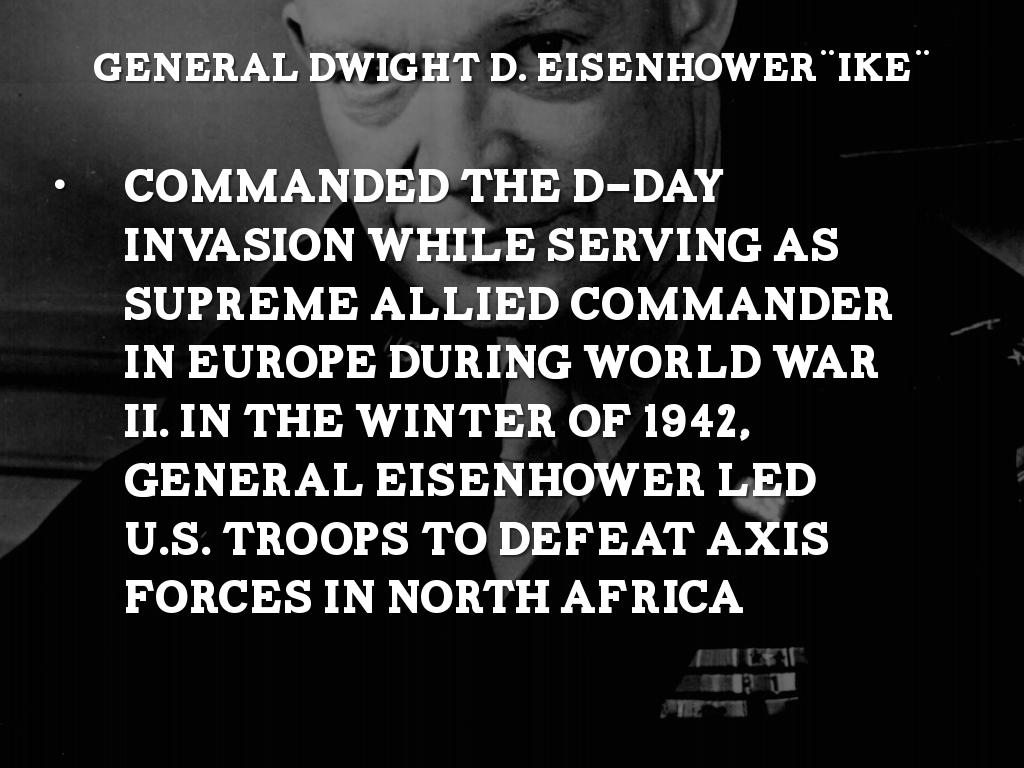 • Commanded the D-Day invasion while serving as Supreme Allied Commander in Europe during World War II. In the winter of 1942, General Eisenhower led U.S. troops to defeat Axis forces in North Africa