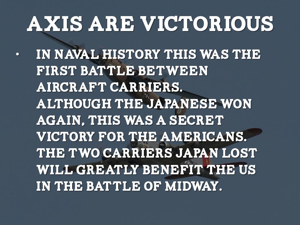 • In naval history this was the first battle between aircraft carriers. Although the Japanese won again, this was a secret victory for the Americans. The two carriers Japan lost will greatly benefit the US in the Battle of Midway.
