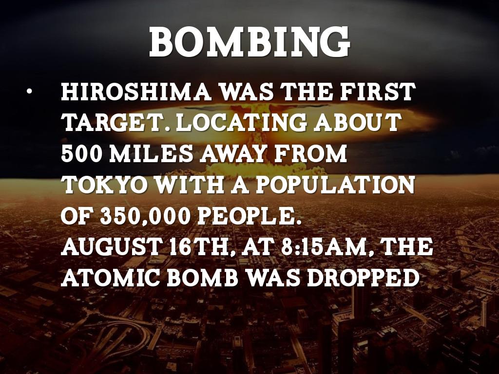 • Hiroshima was the first target. Locating about 500 miles away from Tokyo with a population of 350,000 people. August 16th, at 8:15am, the atomic bomb was dropped