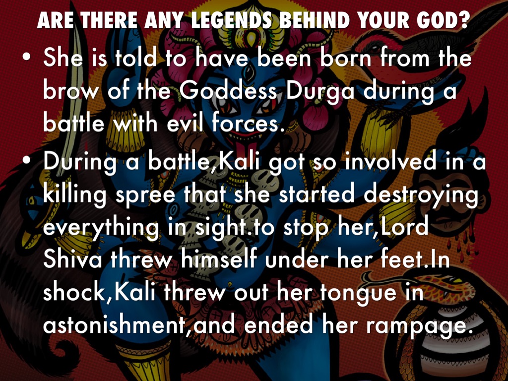 During a battle,Kali got so involved in a killing spree that she started destroying everything in sight.to stop her,Lord Shiva threw himself under her feet.In shock,Kali threw out her tongue in astonishment,and ended her rampage.