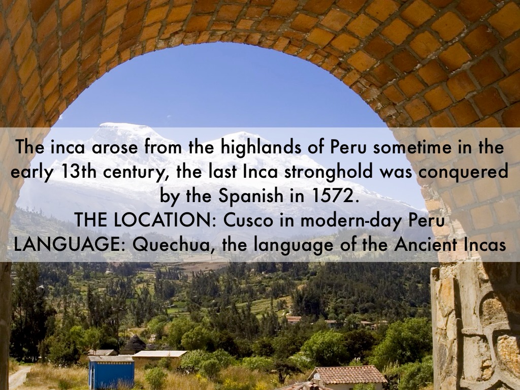 The inca arose from the highlands of Peru sometime in the early 13th century, the last Inca stronghold was conquered by the Spanish in 1572. THE LOCATION: Cusco in modern-day Peru LANGUAGE: Quechua, the language of the Ancient Incas