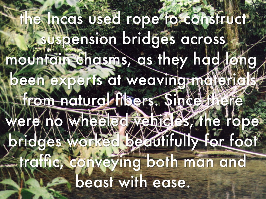 the Incas used rope to construct suspension bridges across mountain chasms, as they had long been experts at weaving materials from natural fibers. Since there were no wheeled vehicles, the rope bridges worked beautifully for foot traffic, conveying both man and beast with ease.