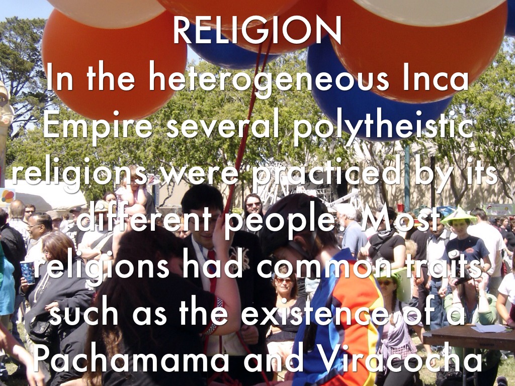 RELIGION In the heterogeneous Inca Empire several polytheistic religions were practiced by its different people. Most religions had common traits such as the existence of a Pachamama and Viracocha