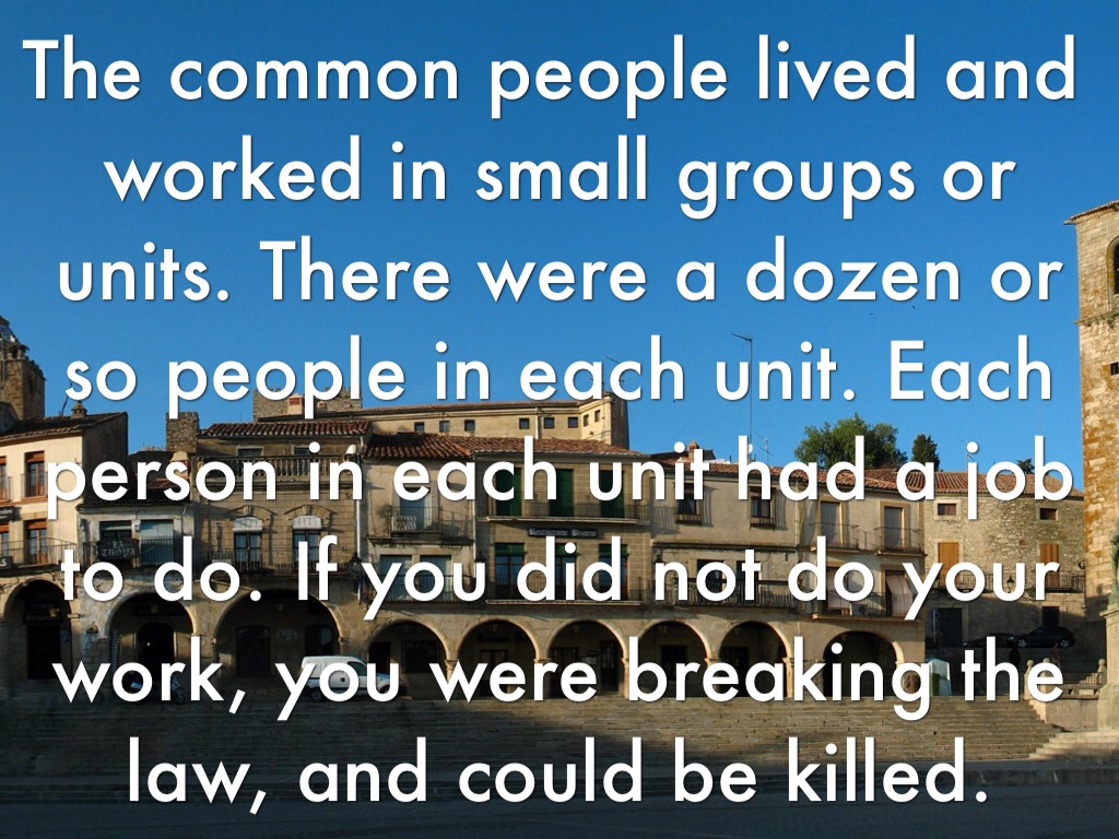 The common people lived and worked in small groups or units. There were a dozen or so people in each unit. Each person in each unit had a job to do. If you did not do your work, you were breaking the law, and could be killed.