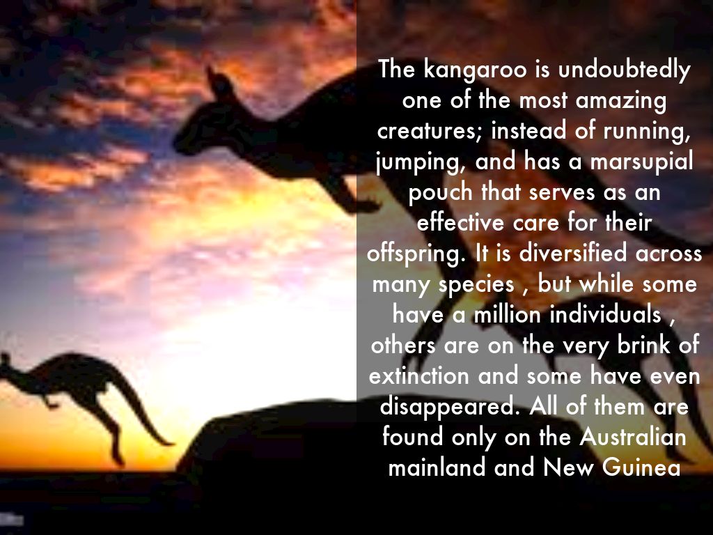 The kangaroo is undoubtedly one of the most amazing creatures; instead of running, jumping, and has a marsupial pouch that serves as an effective care for their offspring. It is diversified across many species , but while some have a million individuals , others are on the very brink of extinction and some have even disappeared. All of them are found only on the Australian mainland and New Guinea