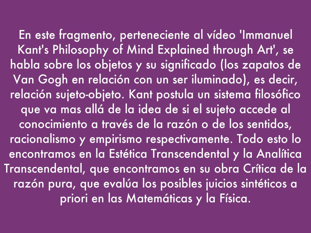 En este fragmento, perteneciente al vídeo 'Immanuel Kant's Philosophy of Mind Explained through Art', se habla sobre los objetos y su significado (los zapatos de Van Gogh en relación con un ser iluminado), es decir, relación sujeto-objeto. Kant postula un sistema filosófico que va mas allá de la idea de si el sujeto accede al conocimiento a través de la razón o de los sentidos, racionalismo y empirismo respectivamente. Todo esto lo encontramos en la Estética Transcendental y la Analítica Transcendental, que encontramos en su obra Crítica de la razón pura, que evalúa los posibles juicios sintéticos a priori en las Matemáticas y la Física.