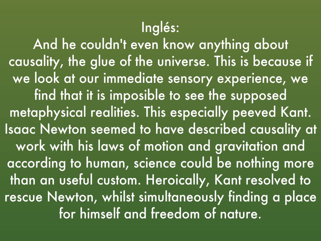 Él no podía saber nada sobre las causas. Esto se debe a que si miramos a nuestra immediata experiencia sensorial, vemos que es imposible ver la supuestas realidades metafísicas. Esto fastidió especialmente a Kant. Parecía que Isaac Newton había descrito la causalidad en el trabajo con sus leyes de movimiento y gravitación, y de acuerdo con los humanos, la ciencia no podía ser más que un hábito útil. Heroicamente, Kant corrigió a Newton, al mismo tiempo que encontraba un lugar para sí mismo y la libertad de la naturaleza.
