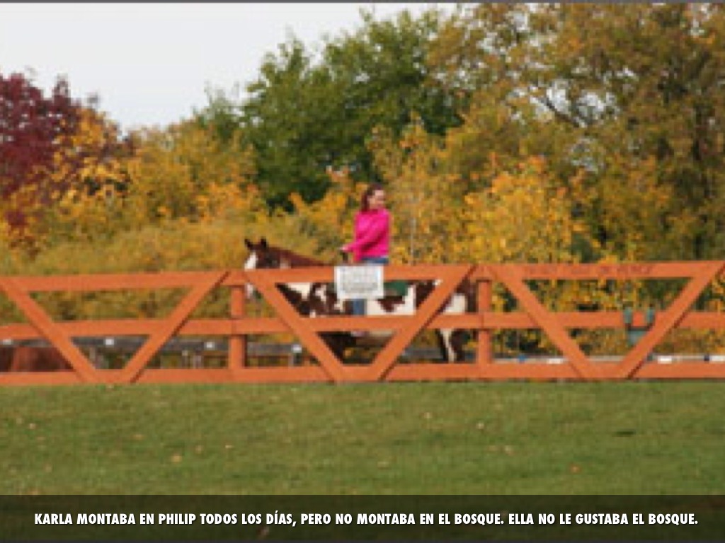 KARLA MONTABA EN PHILIP TODOS LOS DÍAS, PERO NO MONTABA EN EL BOSQUE. ELLA NO LE GUSTABA EL BOSQUE.