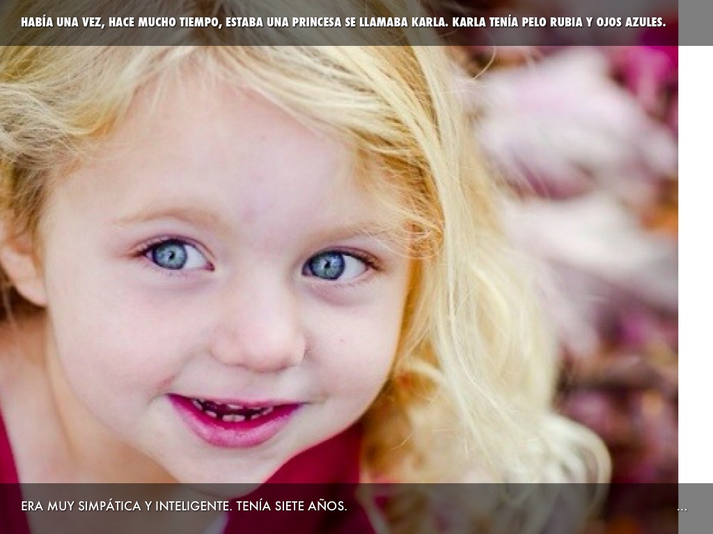 HABÍA UNA VEZ, HACE MUCHO TIEMPO, ESTABA UNA PRINCESA SE LLAMABA KARLA. KARLA TENÍA PELO RUBIA Y OJOS AZULES.