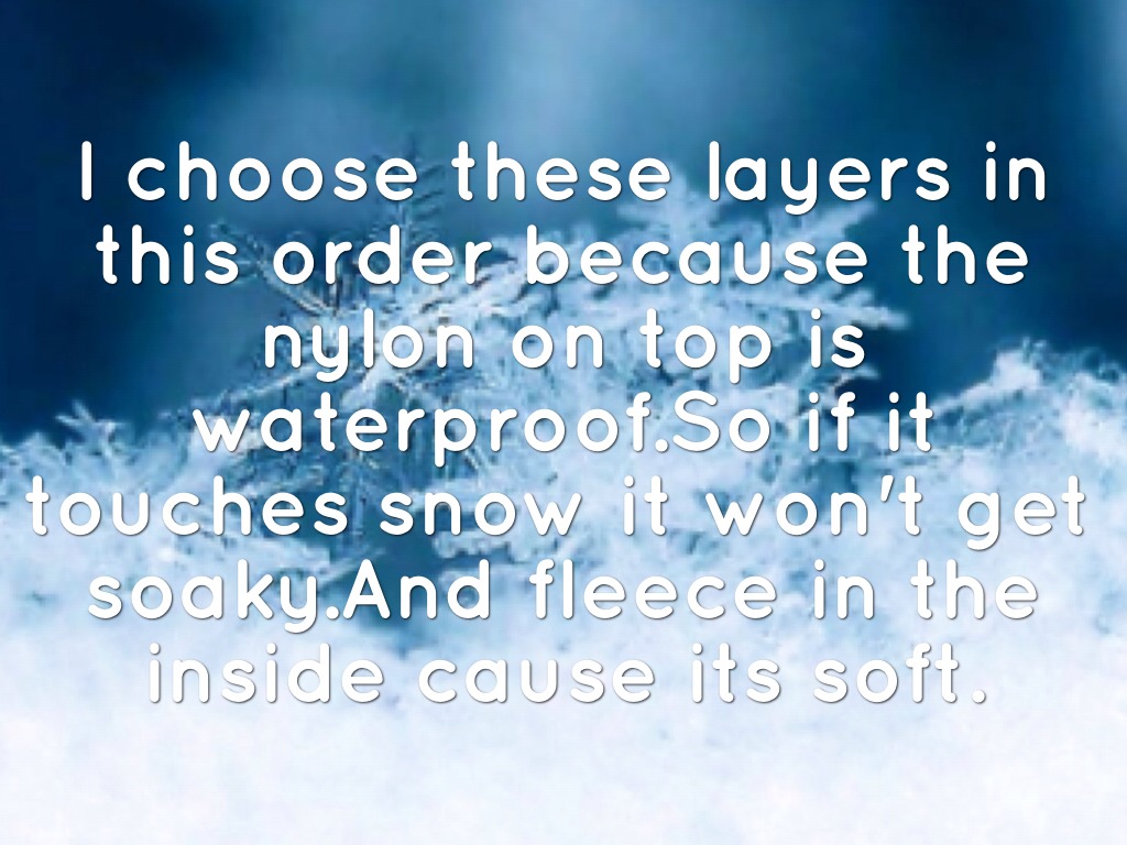 if it touches snow it won't get soaky.And fleece in the inside cause its soft.