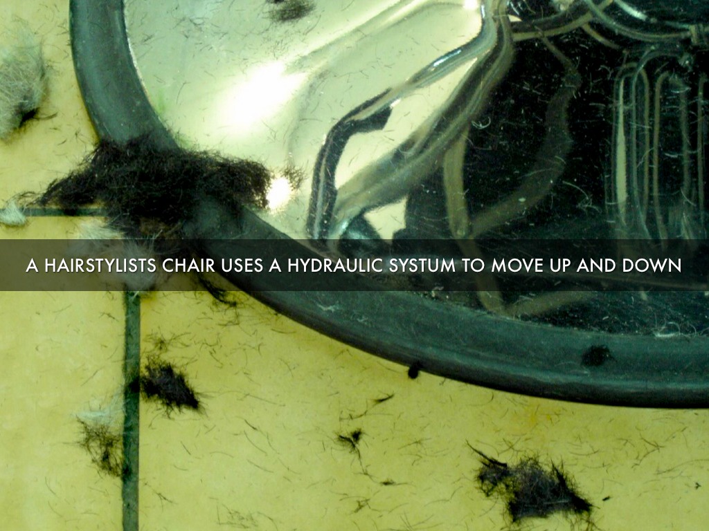 A HAIRSTYLISTS CHAIR USES A HYDRAULIC SYSTUM TO MOVE UP AND DOWN