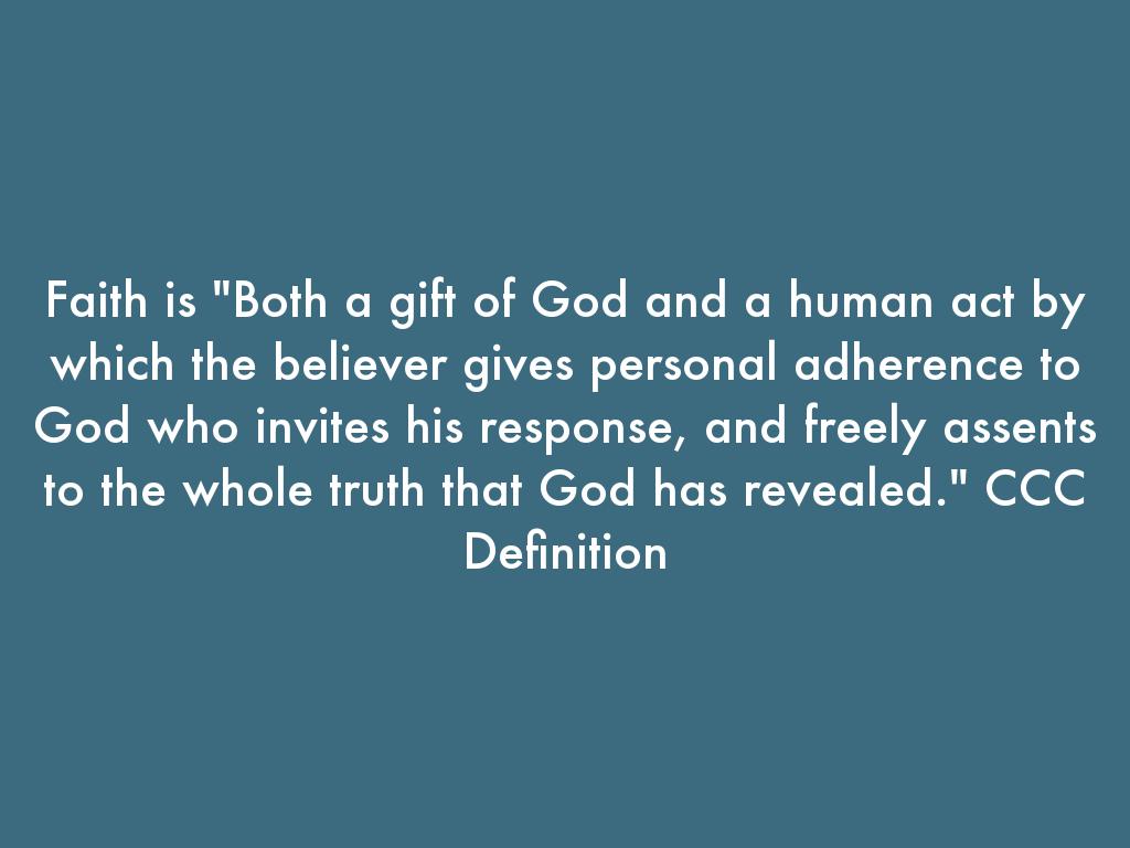 Faith is "Both a gift of God and a human act by which the believer gives personal adherence to God who invites his response, and freely assents to the whole truth that God has revealed." CCC Definition