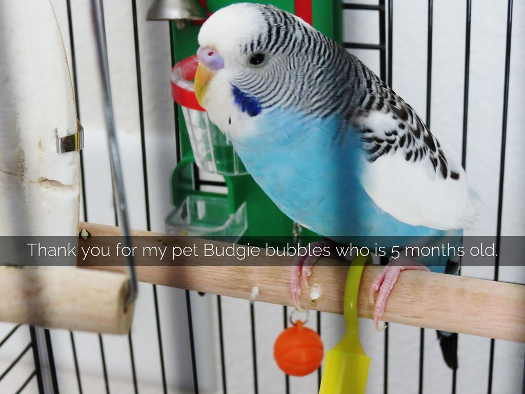 Thank you for my pet Budgie bubbles who is 5 months old.