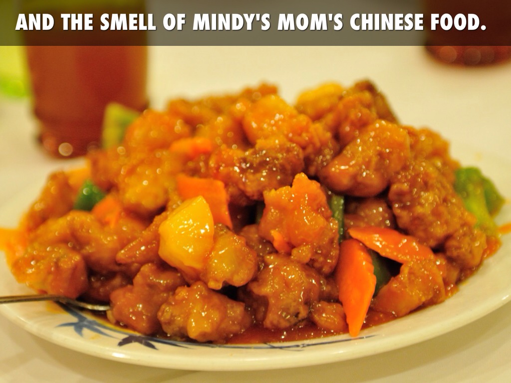 AND THE SMELL OF MINDY'S MOM'S CHINESE FOOD.