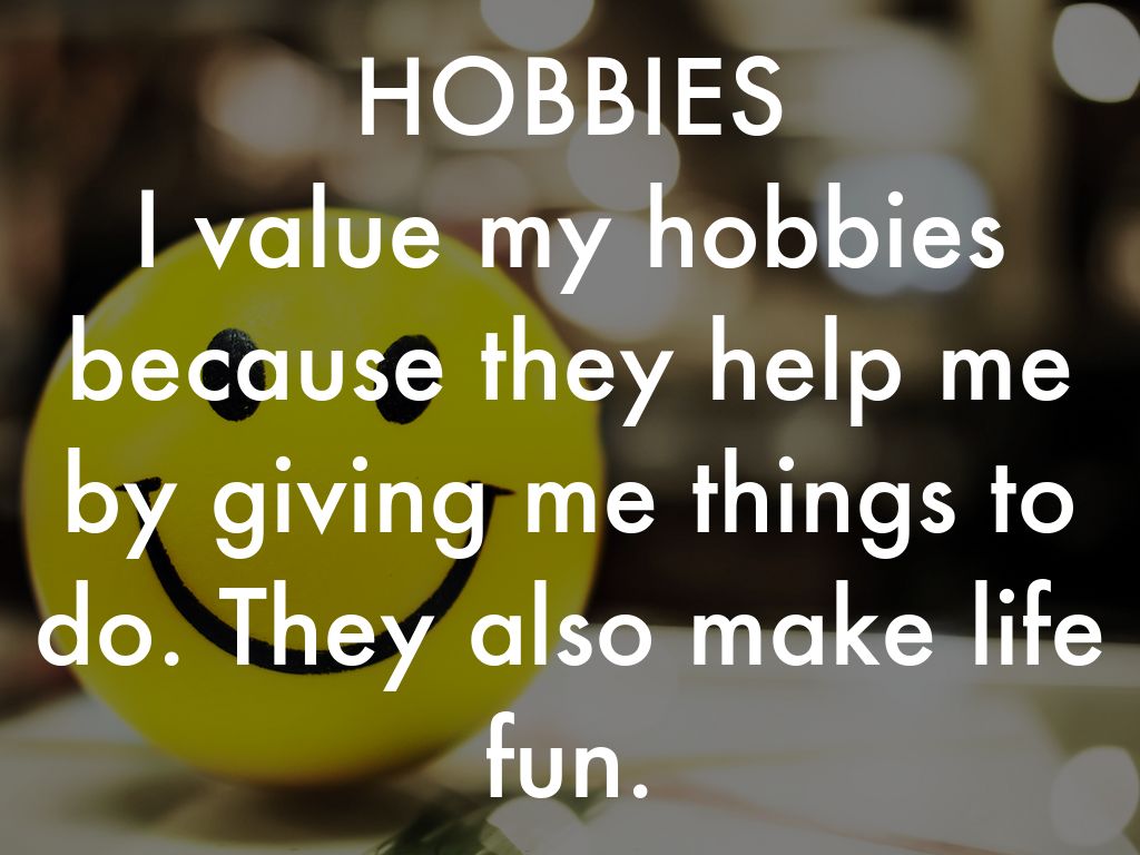 I value my hobbies because they help me by giving me things to do. They also make life fun.