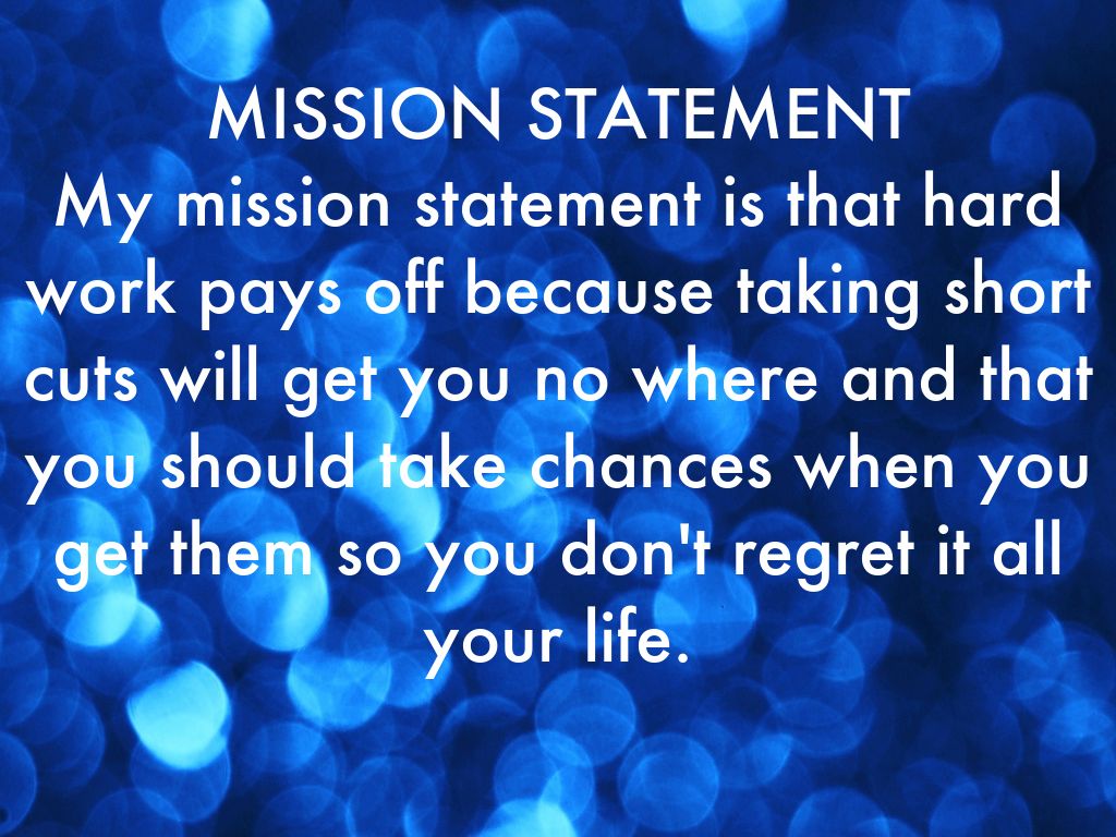My mission statement is that hard work pays off because taking short cuts will get you no where and that you should take chances when you get them so you don't regret it all your life.