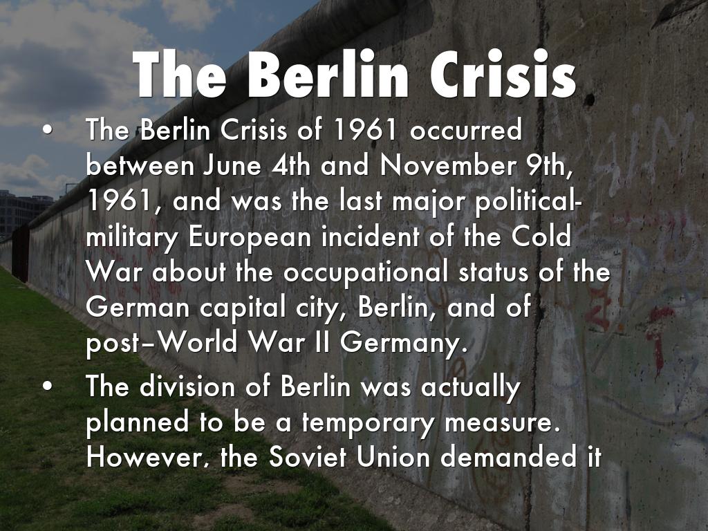 The Berlin Crisis of 1961 occurred between June 4th and November 9th, 1961, and was the last major political-military European incident of the Cold War about the occupational status of the German capital city, Berlin, and of post–World War II Germany.