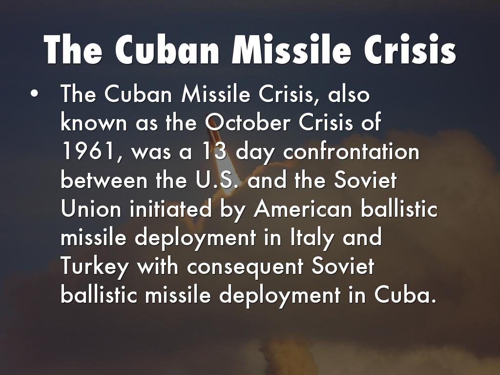 The Cuban Missile Crisis, also known as the October Crisis of 1961, was a 13 day confrontation between the U.S. and the Soviet Union initiated by American ballistic missile deployment in Italy and Turkey with consequent Soviet ballistic missile deployment in Cuba.