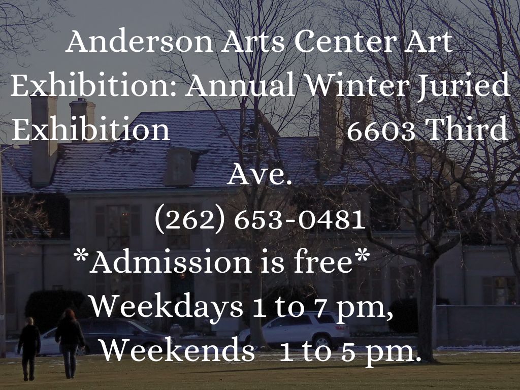 Anderson Arts Center Art Exhibition: Annual Winter Juried Exhibition 6603 Third Ave. (262) 653-0481 *Admission is free* Weekdays 1 to 7 pm, Weekends 1 to 5 pm.