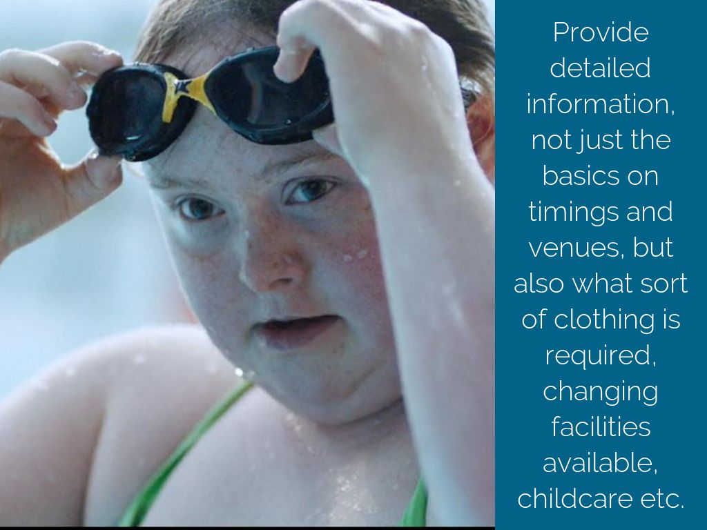 Provide detailed information, not just the basics on timings and venues, but also what sort of clothing is required, changing facilities available, childcare etc.