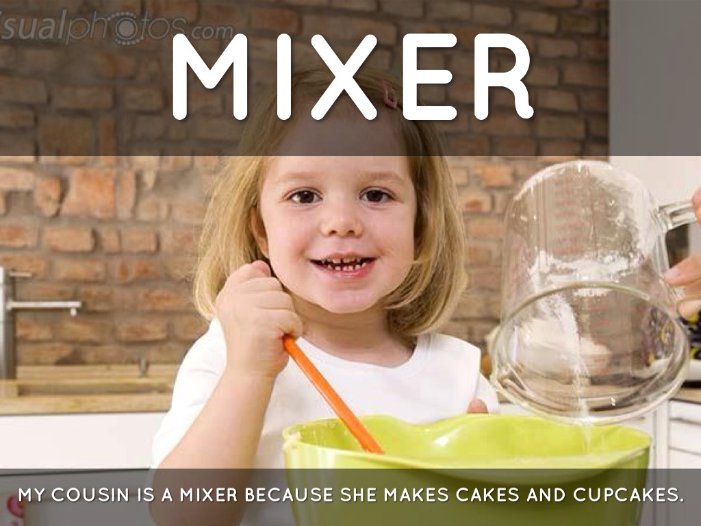 MY COUSIN IS A MIXER BECAUSE SHE MAKES CAKES AND CUPCAKES.
