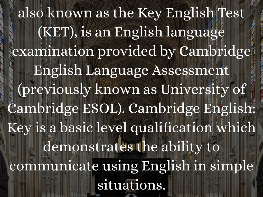 also known as the Key English Test (KET), is an English language examination provided by Cambridge English Language Assessment (previously known as University of Cambridge ESOL). Cambridge English: Key is a basic level qualification which demonstrates the ability to communicate using English in simple situations.