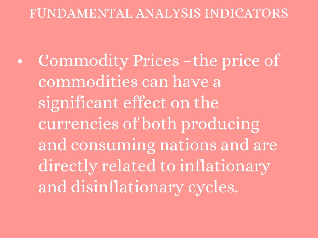 - Commodity Prices –the price of commodities can have a significant effect on the currencies of both producing and consuming nations and are directly related to inflationary and disinflationary cycles.