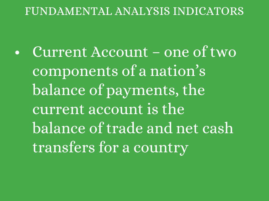 - Current Account – one of two components of a nation’s balance of payments, the current account is the balance of trade and net cash transfers for a country