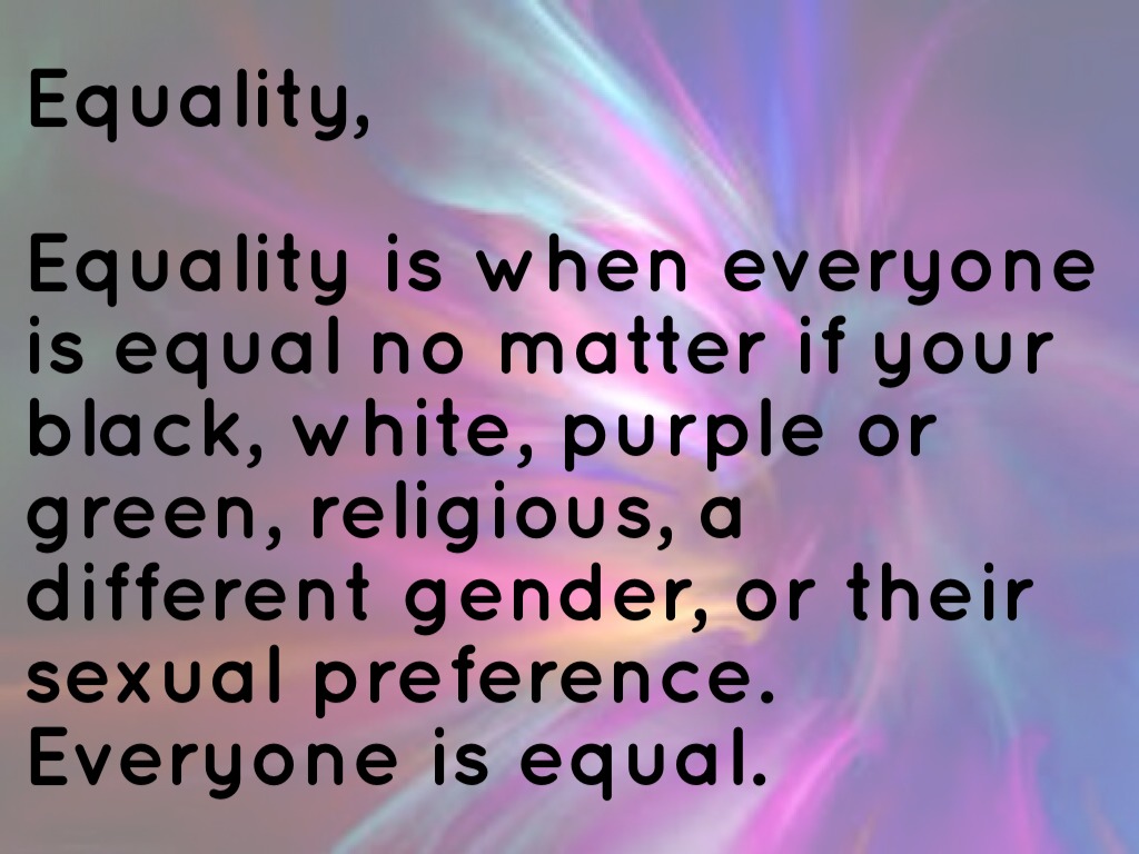 Equality is when everyone is equal no matter if your black, white, purple or green, religious, a different gender, or their sexual preference. Everyone is equal.