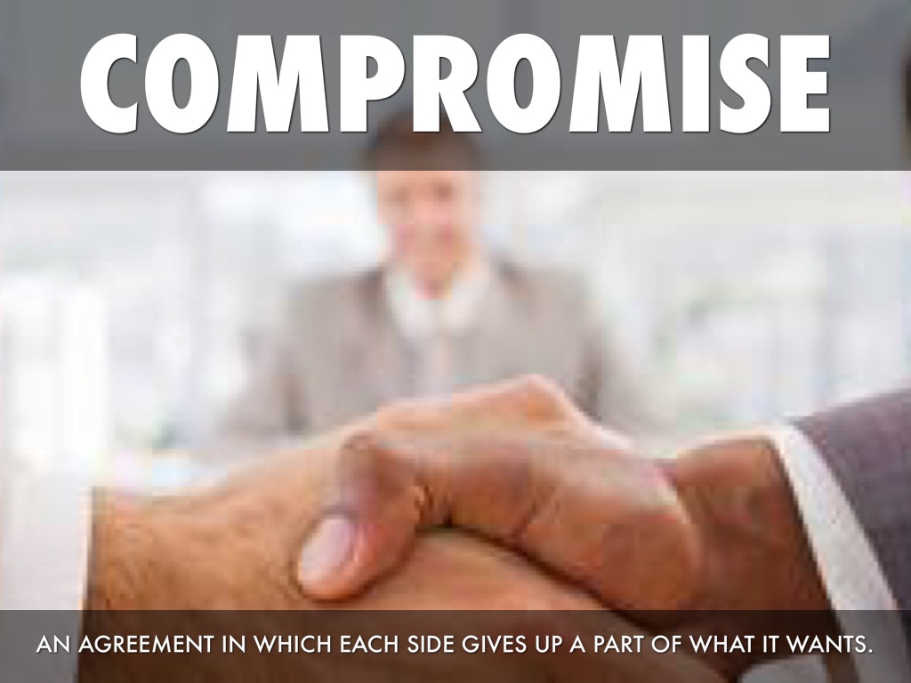 AN AGREEMENT IN WHICH EACH SIDE GIVES UP A PART OF WHAT IT WANTS.