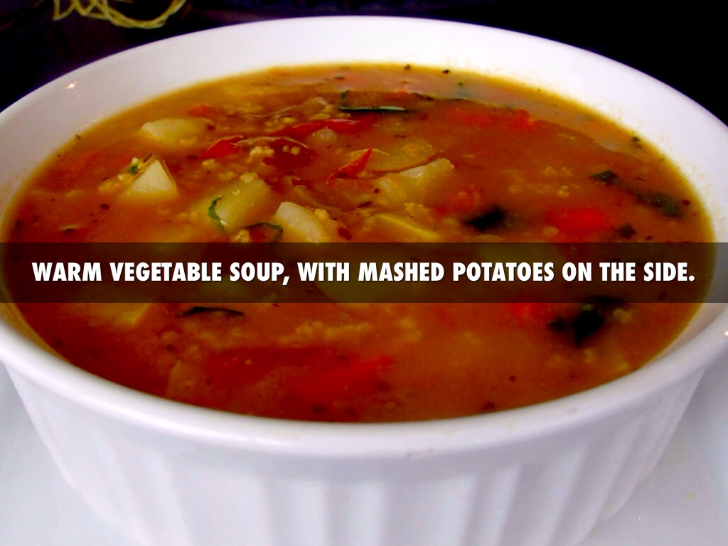 WARM VEGETABLE SOUP, WITH MASHED POTATOES ON THE SIDE.