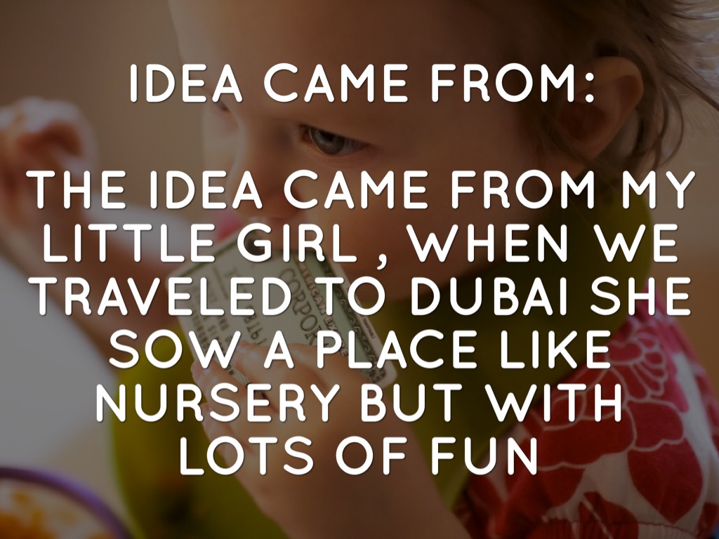 THE IDEA CAME FROM MY LITTLE GIRL , WHEN WE TRAVELED TO DUBAI SHE SOW A PLACE LIKE NURSERY BUT WITH LOTS OF FUN