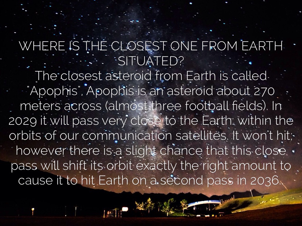 WHERE IS THE CLOSEST ONE FROM EARTH SITUATED? The closest asteroid from Earth is called "Apophis", Apophis is an asteroid about 270 meters across (almost three football fields). In 2029 it will pass very close to the Earth: within the orbits of our communication satellites. It won't hit; however there is a slight chance that this close pass will shift its orbit exactly the right amount to cause it to hit Earth on a second pass in 2036..