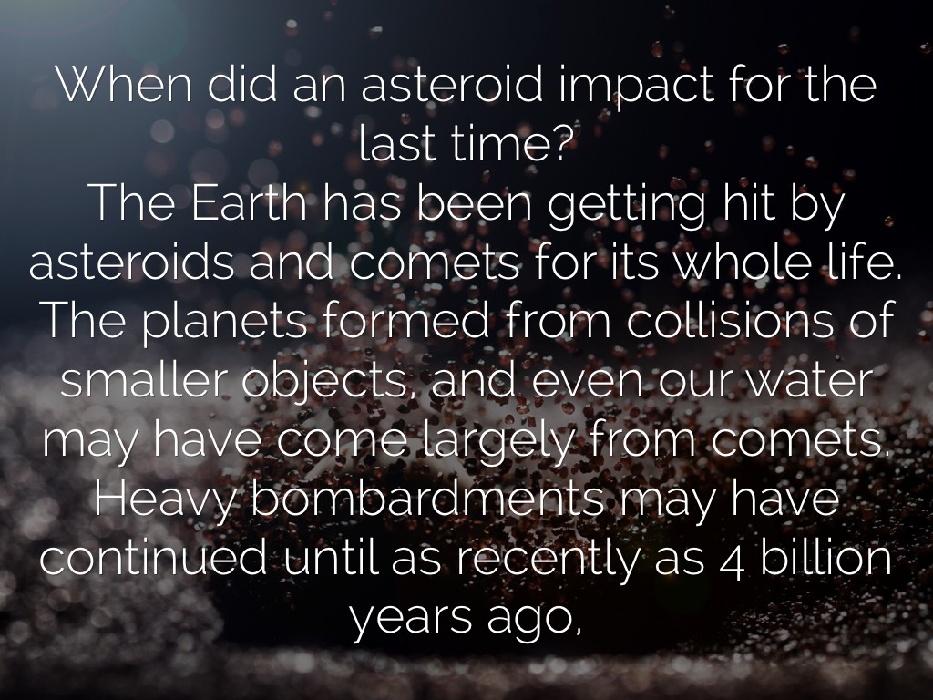 When did an asteroid impact for the last time? The Earth has been getting hit by asteroids and comets for its whole life. The planets formed from collisions of smaller objects, and even our water may have come largely from comets. Heavy bombardments may have continued until as recently as 4 billion years ago,