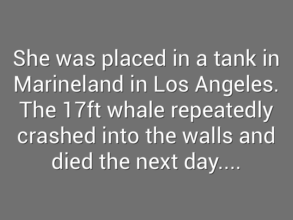 She was placed in a tank in Marineland in Los Angeles. The 17ft whale repeatedly crashed into the walls and died the next day....