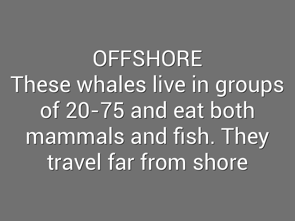 These whales live in groups of 20-75 and eat both mammals and fish. They travel far from shore