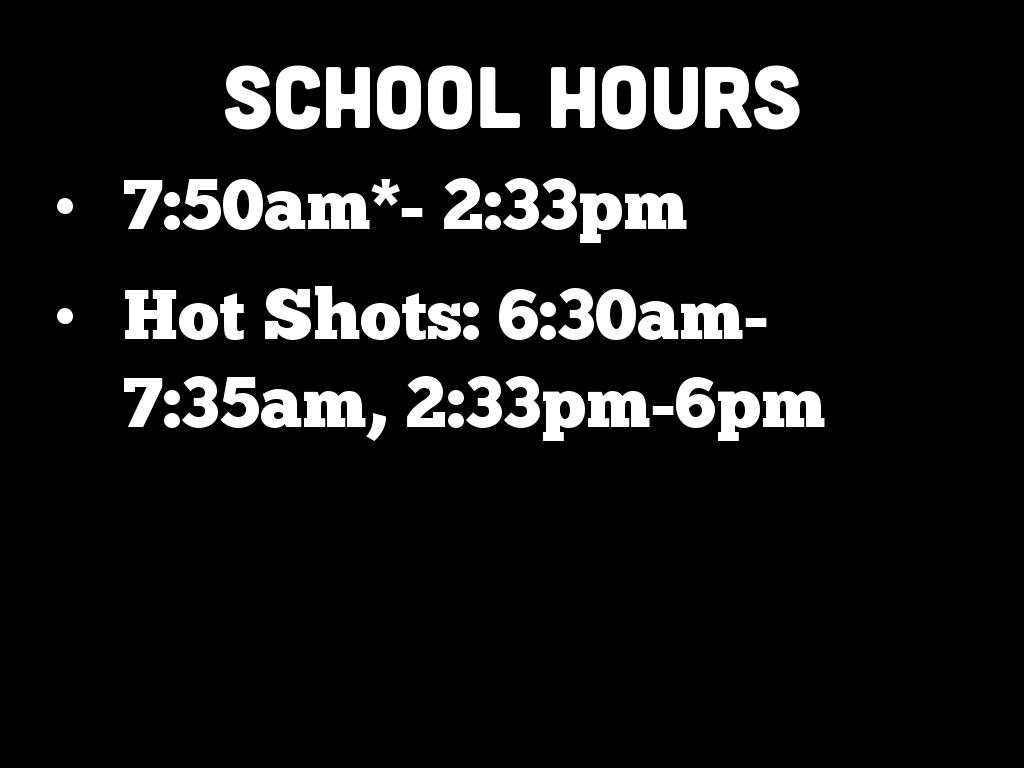 • Hot Shots: 6:30am-7:35am, 2:33pm-6pm