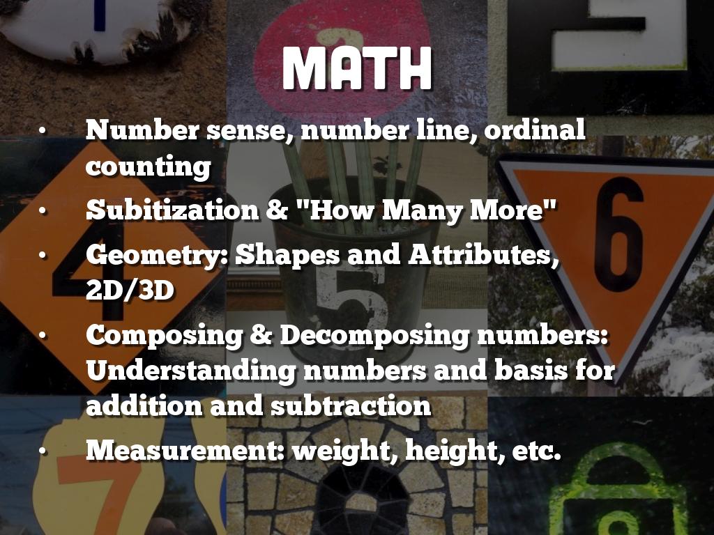• Composing & Decomposing numbers: Understanding numbers and basis for addition and subtraction