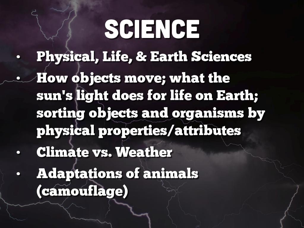 • How objects move; what the sun's light does for life on Earth; sorting objects and organisms by physical properties/attributes