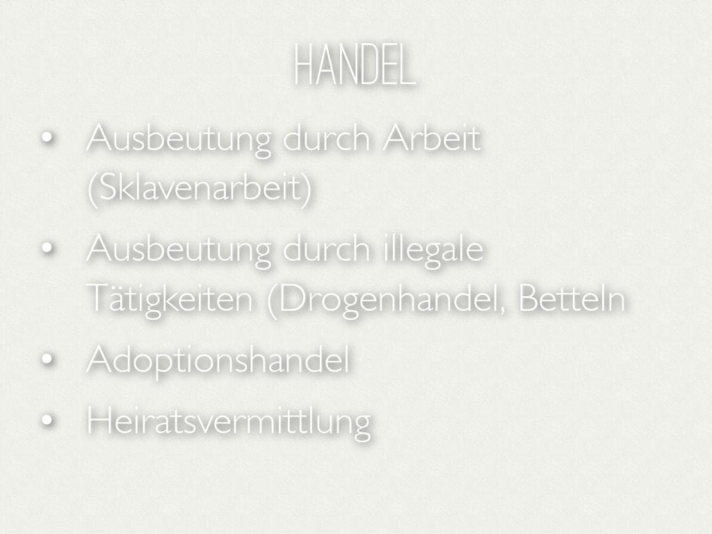 Armut • Drogen- und/oder Alkoholkonsum • Krankheit der Eltern • Krieg und Vertreibungen • Leichtgläubigkeit bzw. falsche Versprechungen • Diskriminierung
