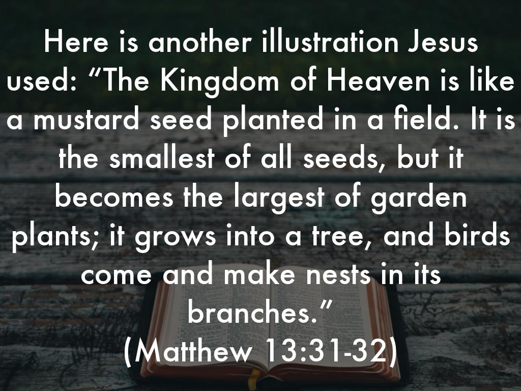 Here is another illustration Jesus used: “The Kingdom of Heaven is like a mustard seed planted in a field. It is the smallest of all seeds, but it becomes the largest of garden plants; it grows into a tree, and birds come and make nests in its branches.” (Matthew 13:31-32)