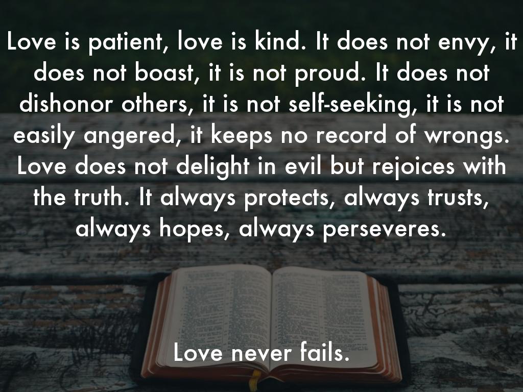 Love is patient, love is kind. It does not envy, it does not boast, it is not proud. It does not dishonor others, it is not self-seeking, it is not easily angered, it keeps no record of wrongs. Love does not delight in evil but rejoices with the truth. It always protects, always trusts, always hopes, always perseveres.