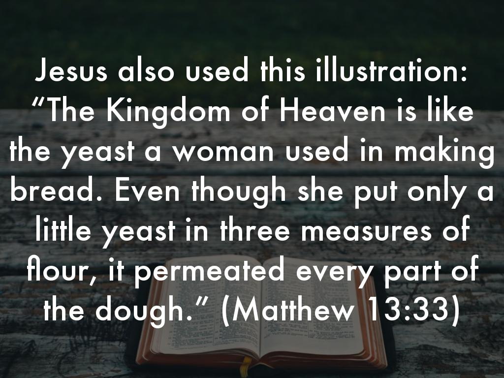 Jesus also used this illustration: “The Kingdom of Heaven is like the yeast a woman used in making bread. Even though she put only a little yeast in three measures of flour, it permeated every part of the dough.” (Matthew 13:33)