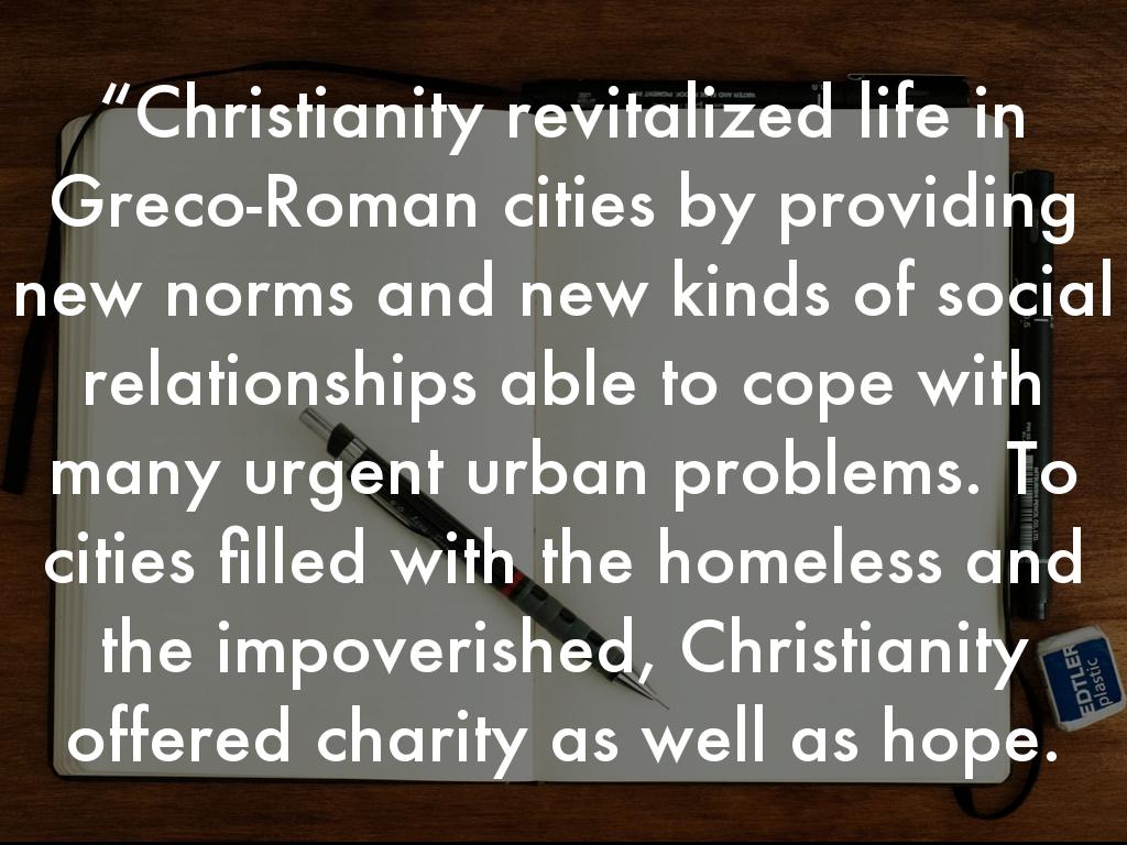 “Christianity revitalized life in Greco-Roman cities by providing new norms and new kinds of social relationships able to cope with many urgent urban problems. To cities filled with the homeless and the impoverished, Christianity offered charity as well as hope.