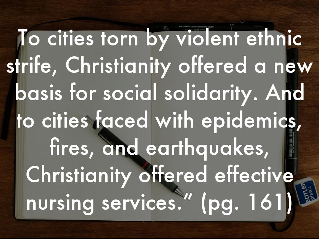 To cities torn by violent ethnic strife, Christianity offered a new basis for social solidarity. And to cities faced with epidemics, fires, and earthquakes, Christianity offered effective nursing services.” (pg. 161)