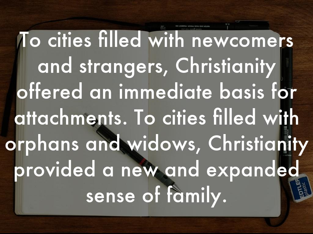 To cities filled with newcomers and strangers, Christianity offered an immediate basis for attachments. To cities filled with orphans and widows, Christianity provided a new and expanded sense of family.