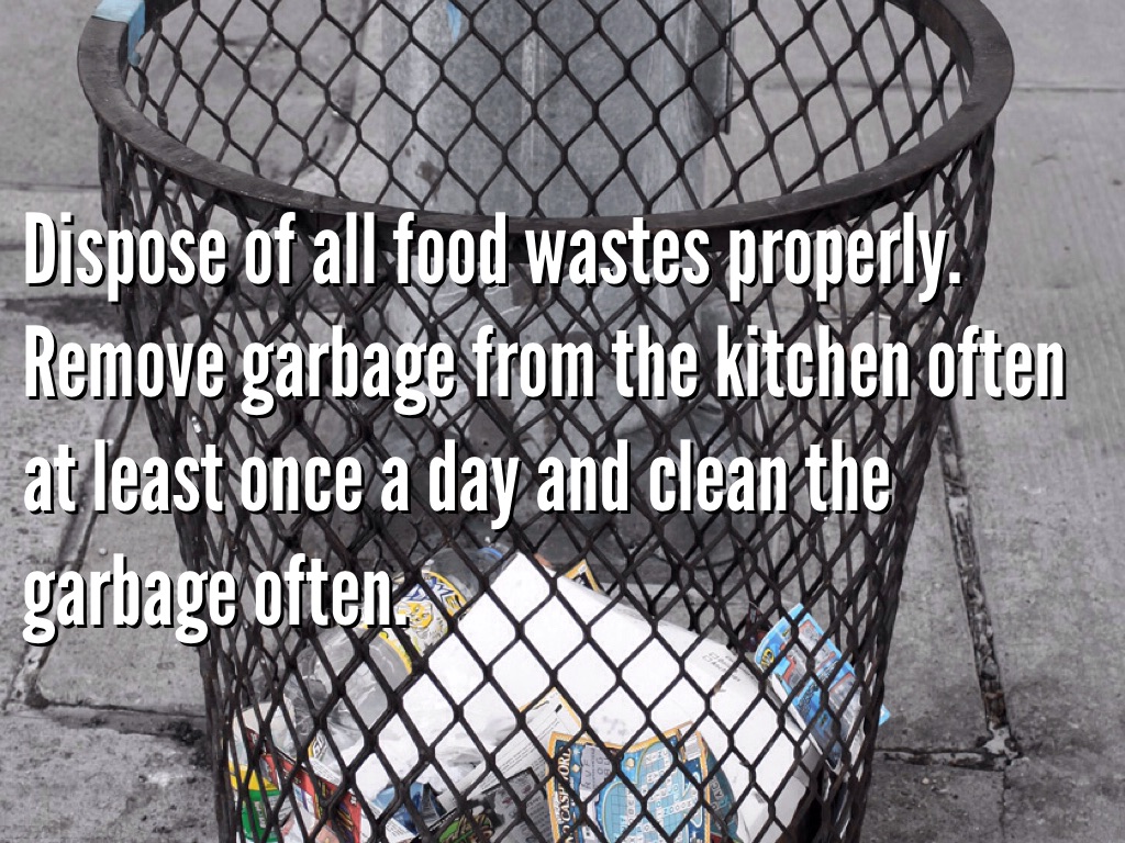 Dispose of all food wastes properly. Remove garbage from the kitchen often at least once a day and clean the garbage often.